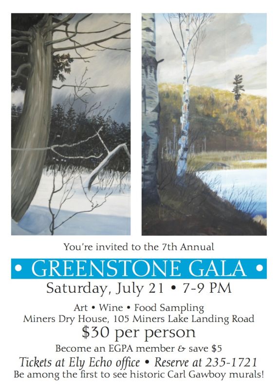 The annual Ely Greenstone Gala held from 7-9pm will be on Saturday, July 21st to kick off the Ely Greenstone Juried Art Show & Sale at the historic Miners Dry House, located at 105 Miners Lake Landing Road.